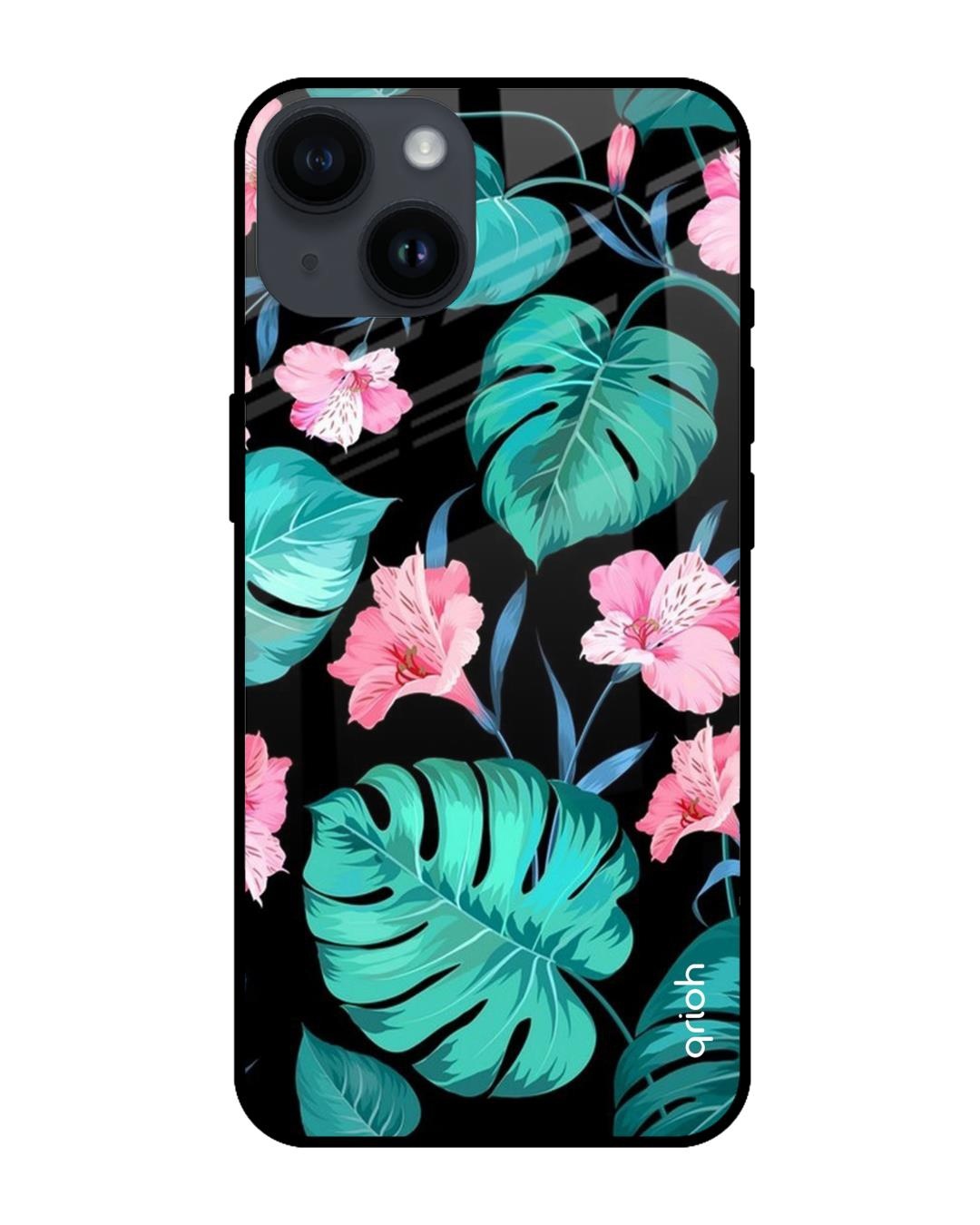 Tropical Leaves & Pink Flowers Premium Glass Cover for Apple iPhone 14 (Shockproof, Light Weight)