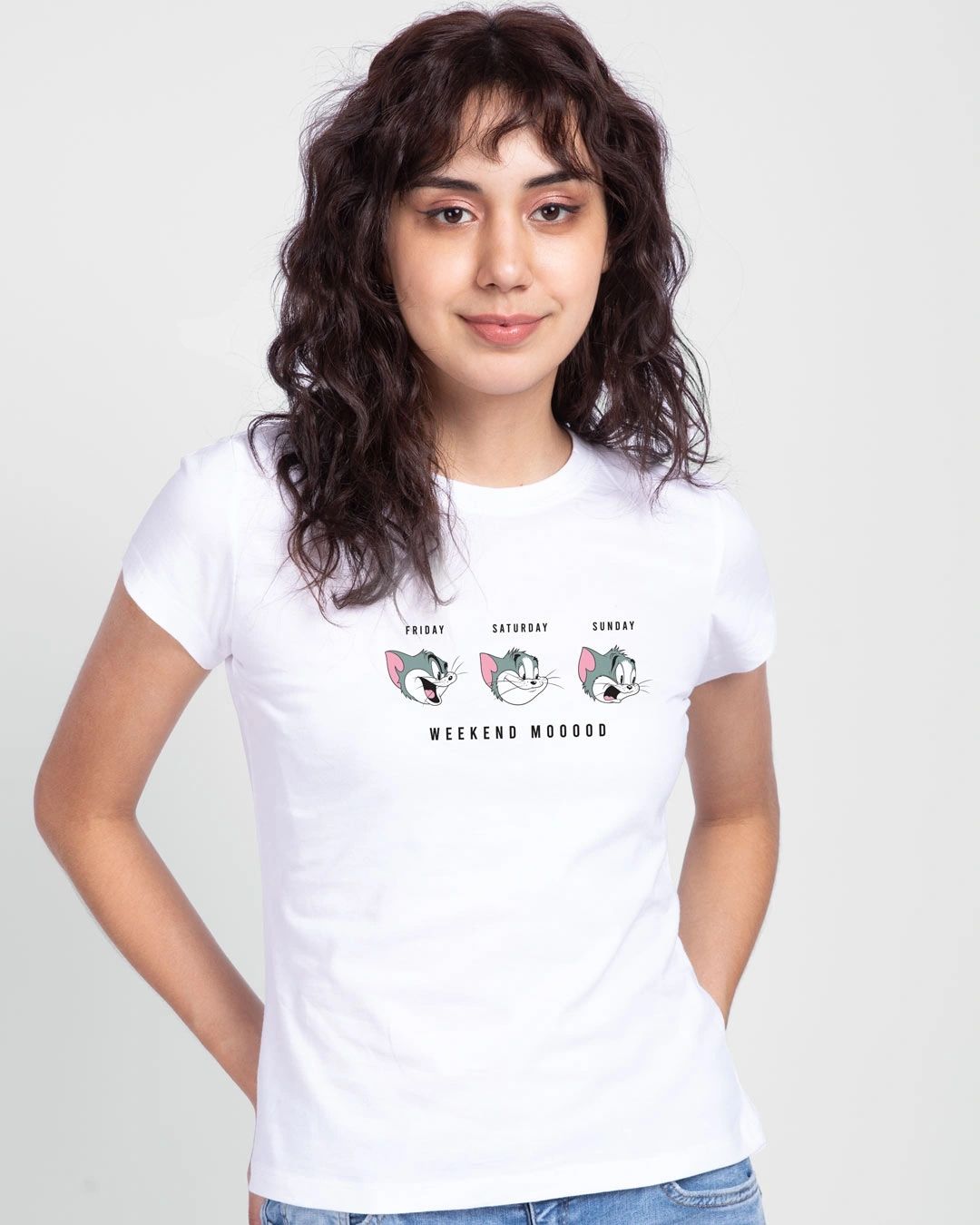 Women's White Weekend Mood Tom Graphic Printed Slim Fit T-shirt