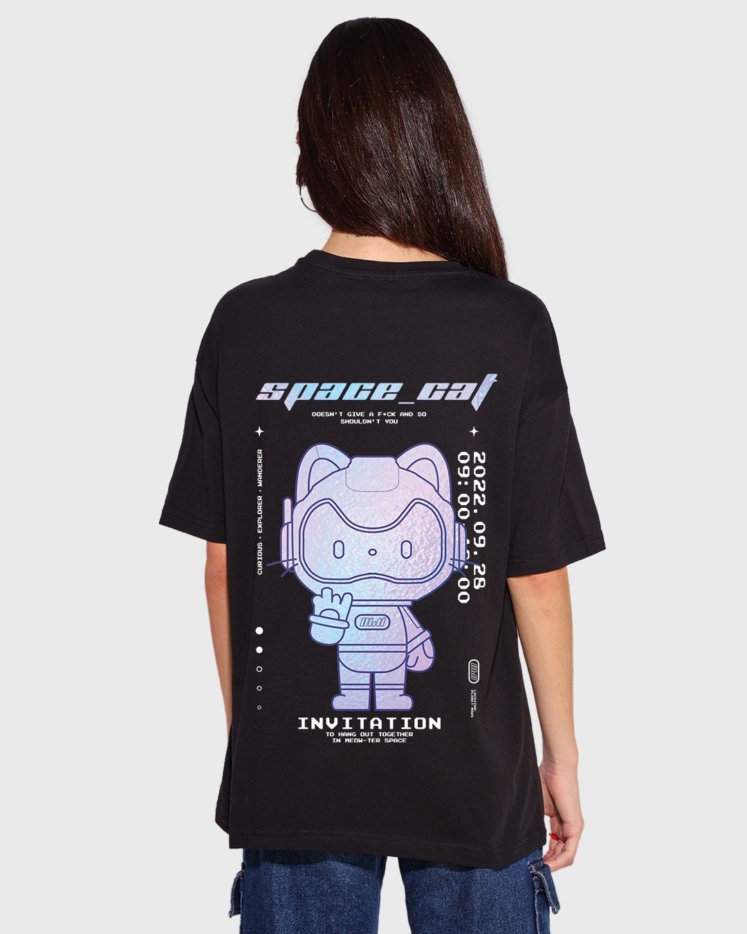 Women's Black Space Cat Graphic Printed Oversized T-shirt