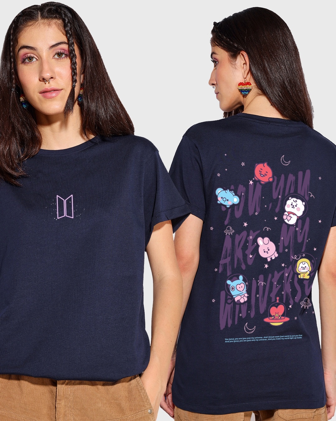 Women's Blue BTS My Universe Graphic Printed Boyfriend T-shirt