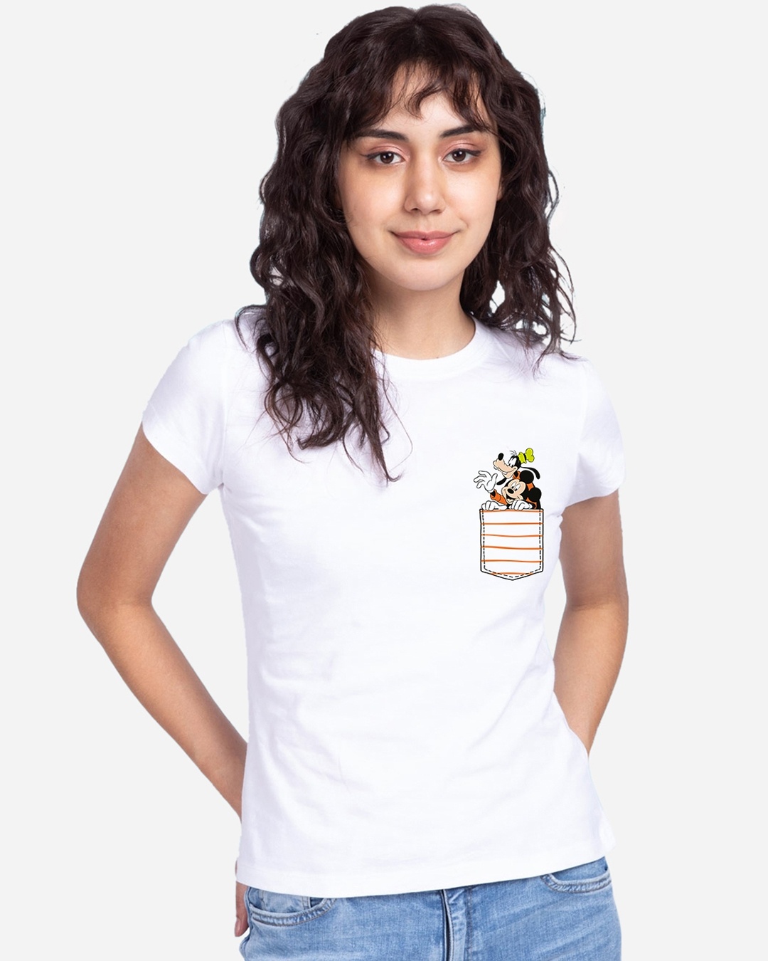 Women's White Goofy Mickey Pocket Graphic Printed T-shirt