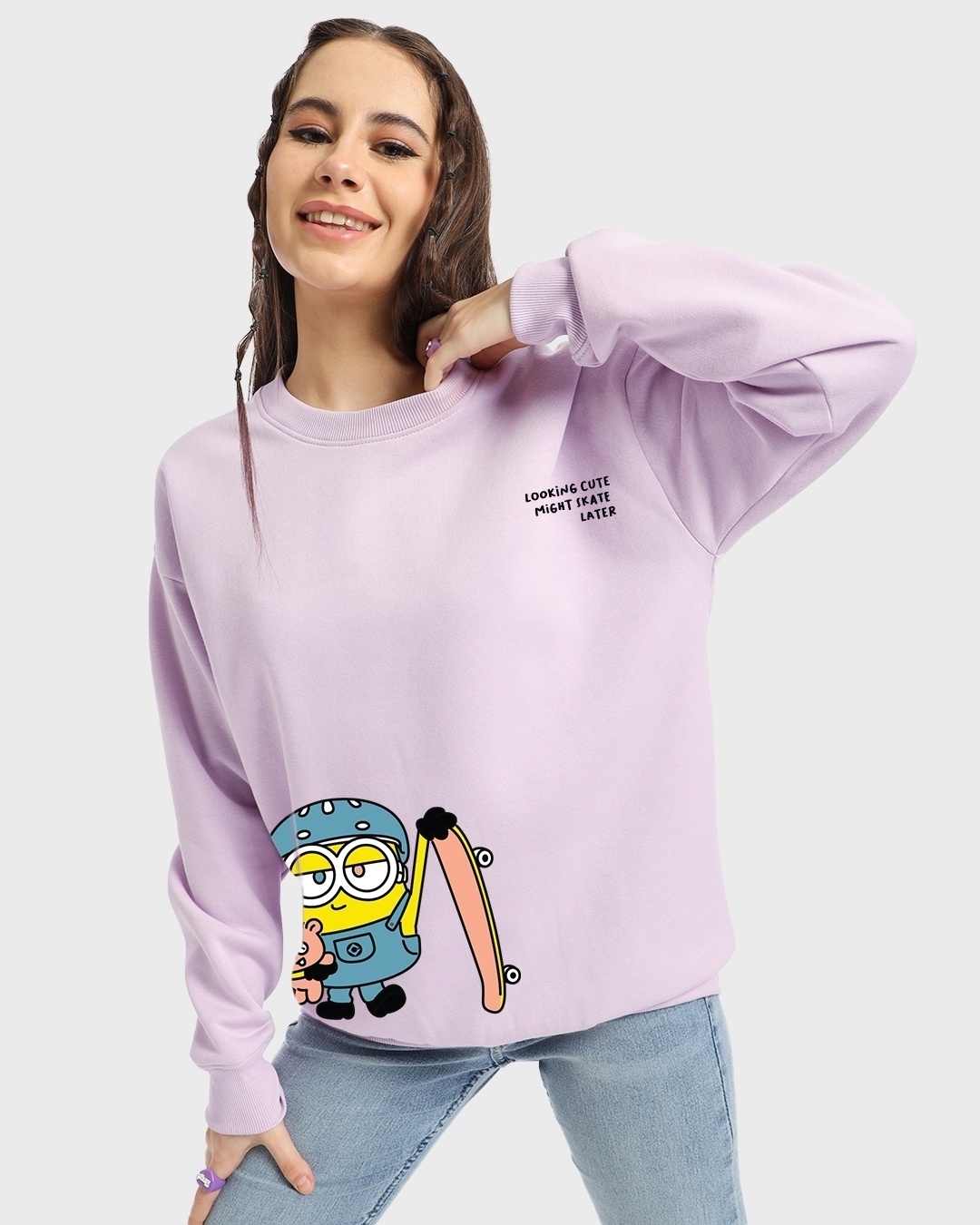 Women's Purple Minions Looking Cute Graphic Printed Oversized Sweatshirt