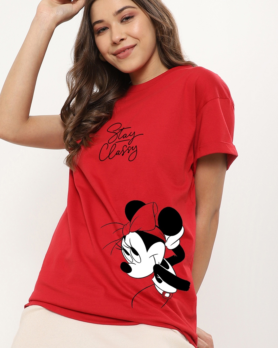 Women's Red Stay Classy Minnie Graphic Printed Boyfriend T-shirt