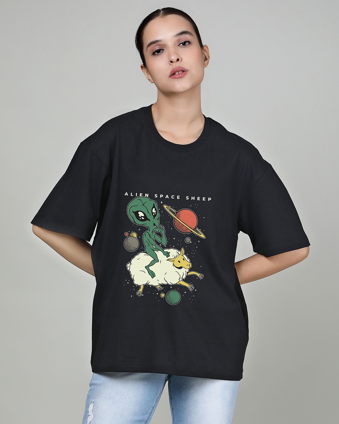 Women's Black Alien Space Sheep Graphic Printed Oversized T-shirt