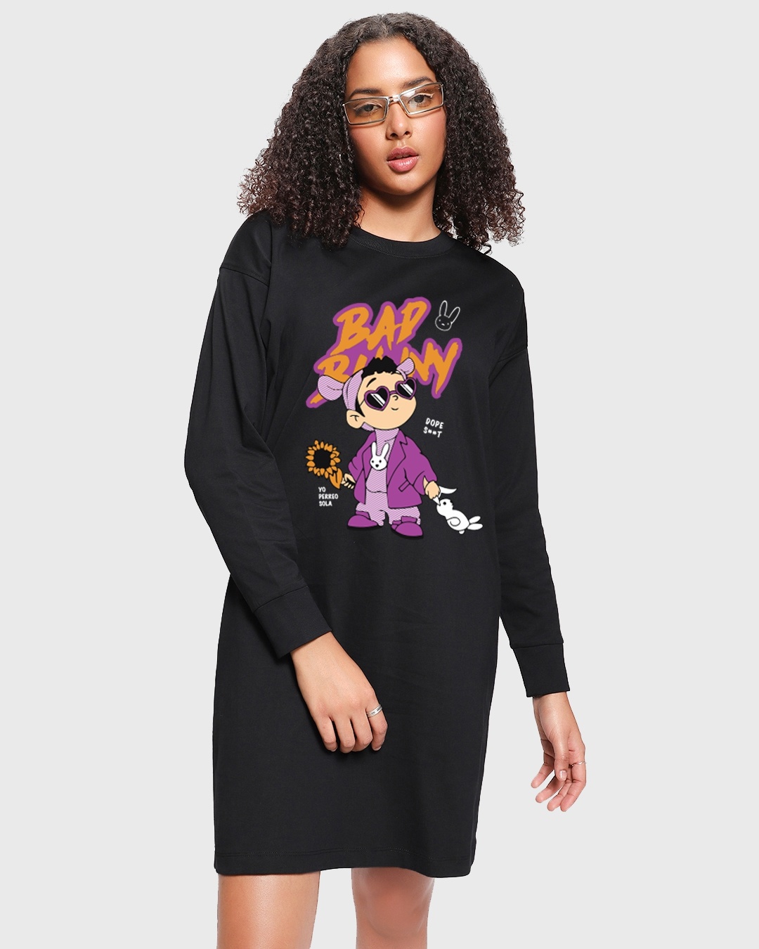 Women's Black Bad Bunny Graphic Printed Oversized Dress