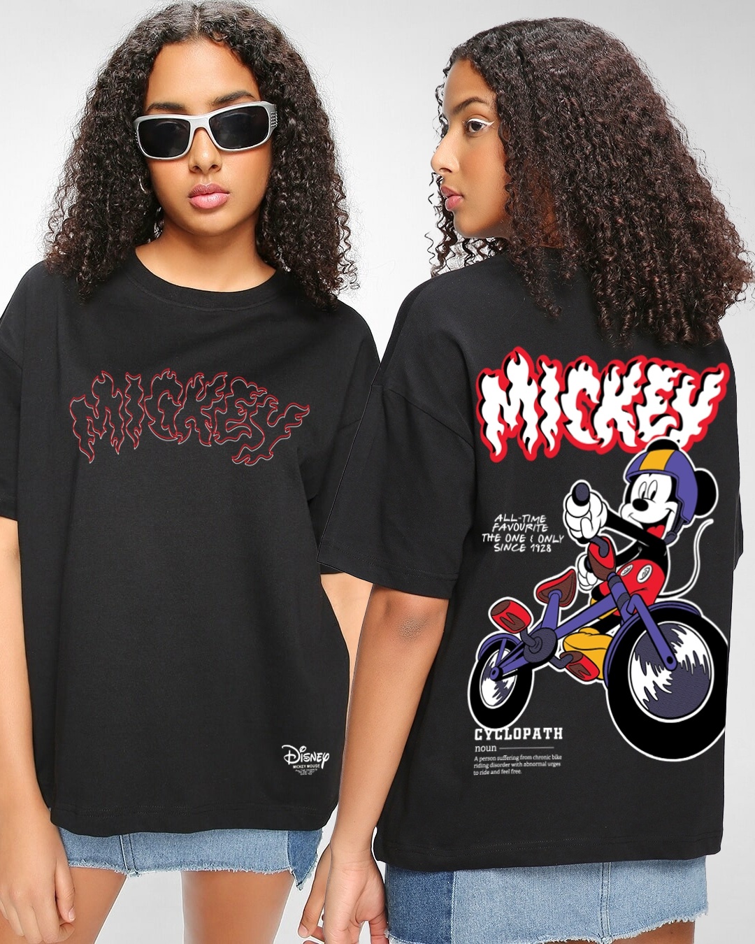 Women's Black Biker Mickey Graphic Printed Oversized T-shirt