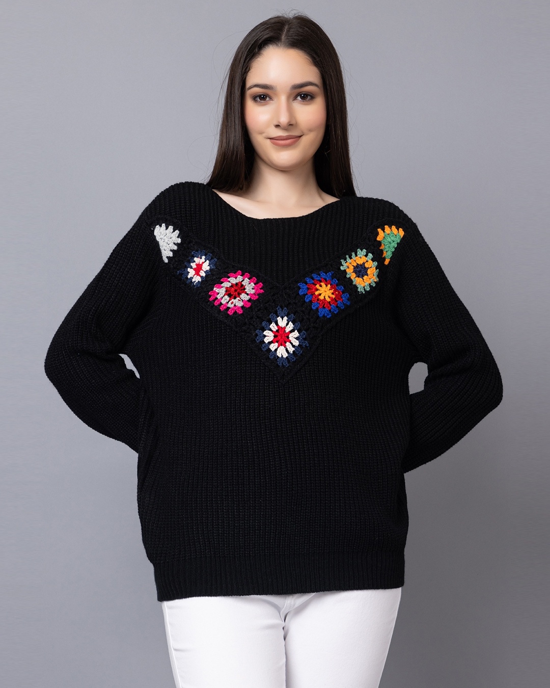 Women's Black Embroidered Loose Fit Crochet Top