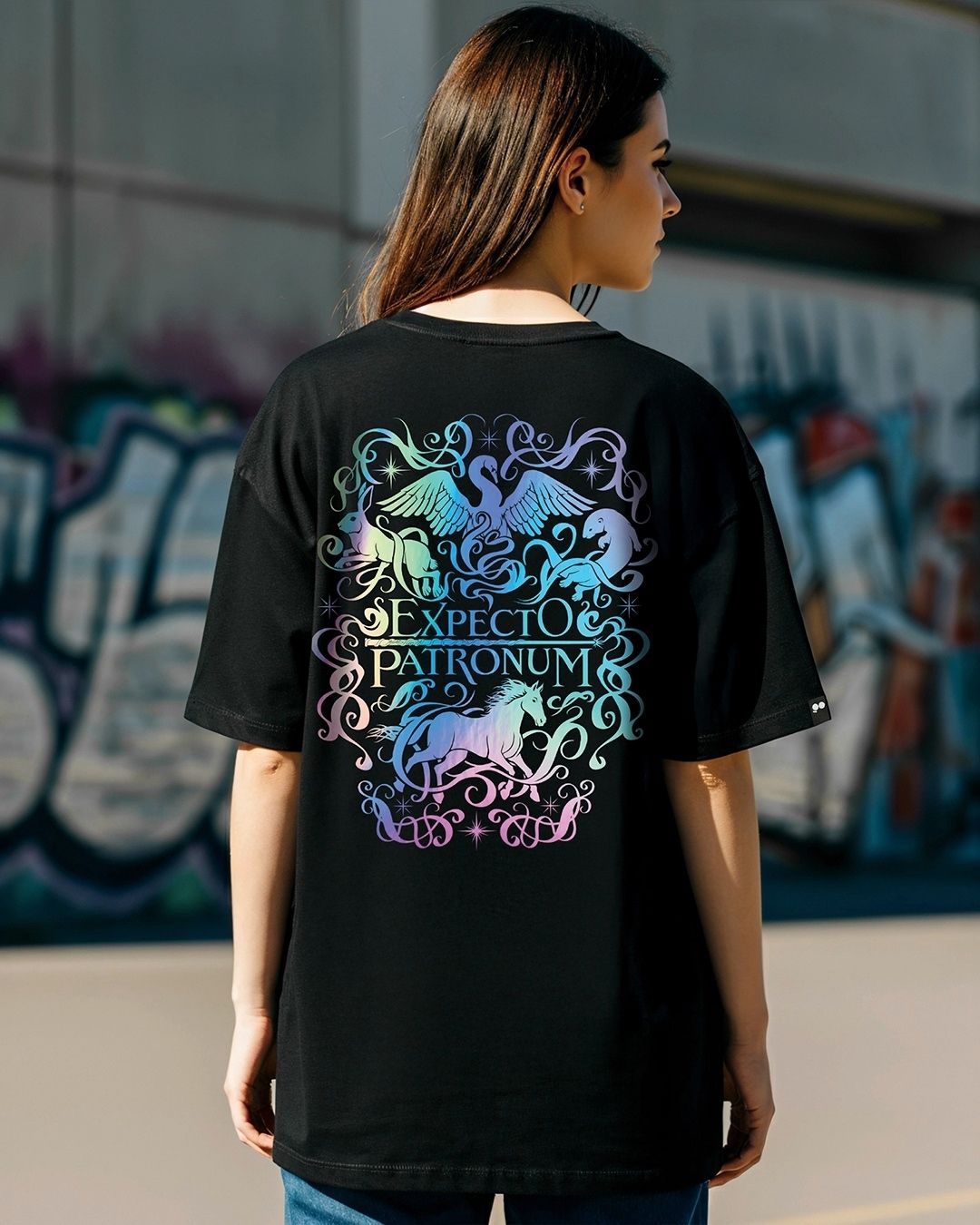 Women's Black Expecto Graphic Printed Oversized T-shirt