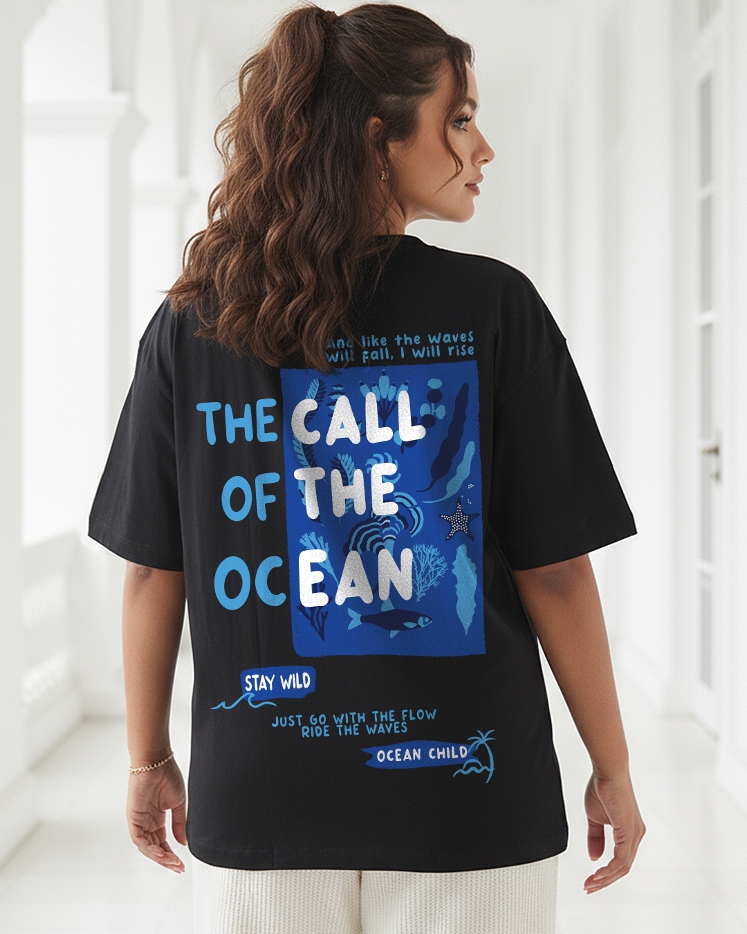 Women's Black Ocean Child Graphic Printed Oversized Plus Size T-shirt