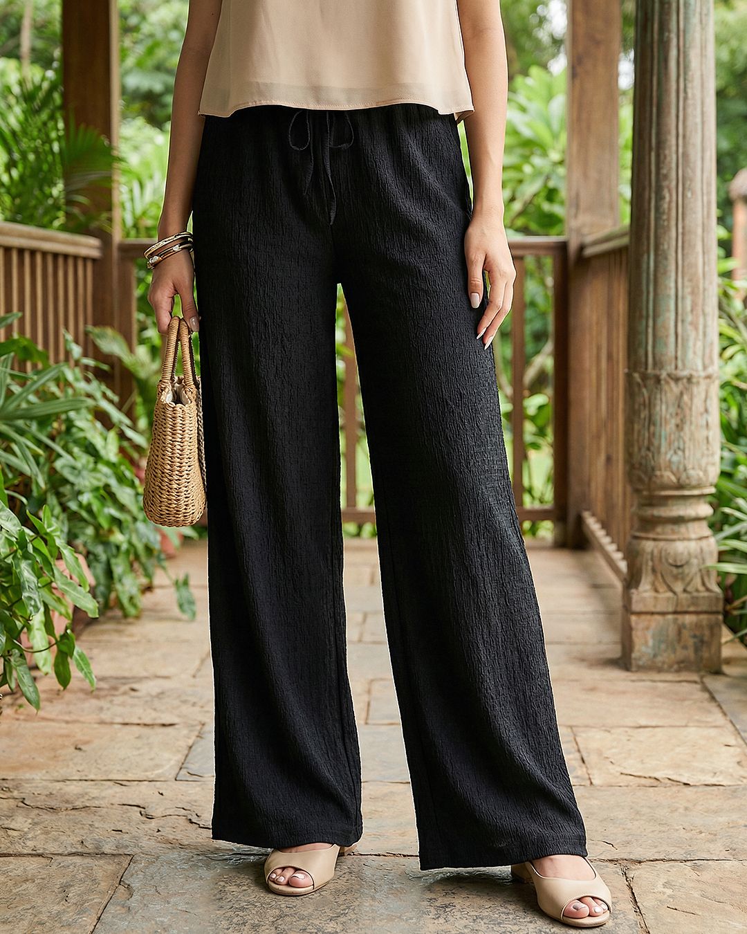 Women's Black Textured Cotton Pants