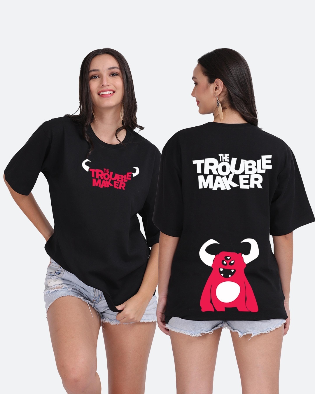 Women's Black Trouble Maker Graphic Printed Oversized T-shirt