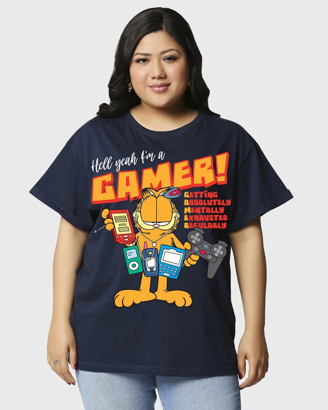 Women's Blue Gamer Garfield Graphic Printed Plus Size Boyfriend T-shirt