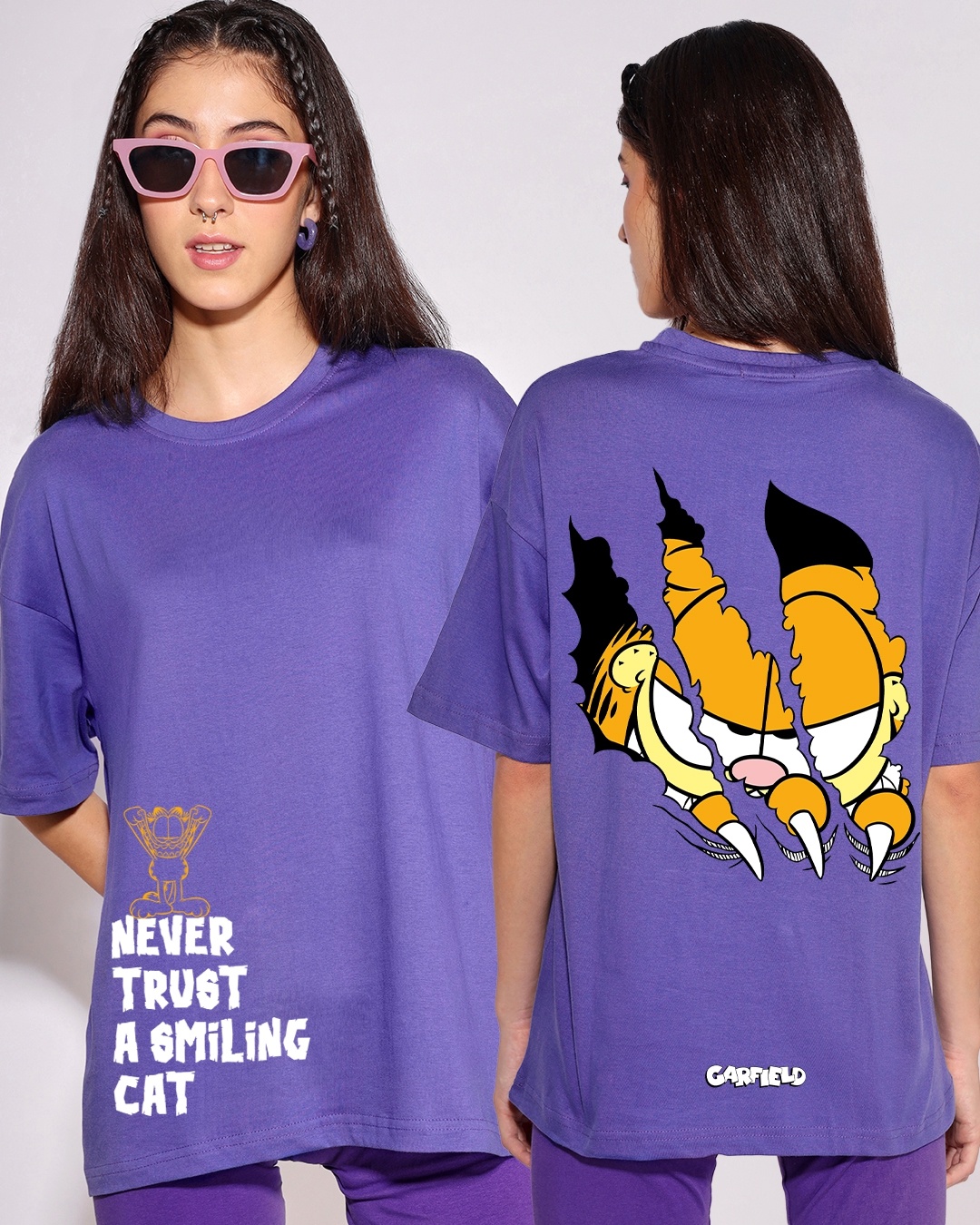 Women's Blue Smiling Cat Graphic Printed Oversized T-shirt