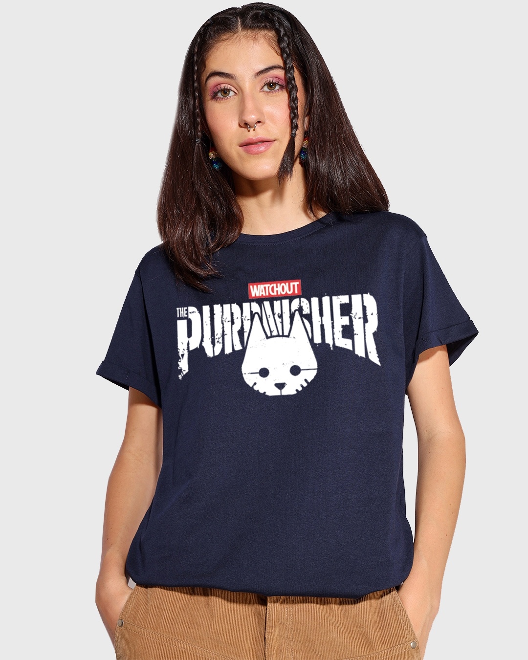 Women's Blue The Purrnisher Graphic Printed Boyfriend T-shirt