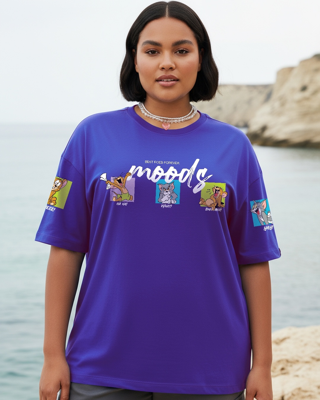 Women's Skipper Blue Tom & Jerry Moods Graphic Printed Oversized Plus Size T-shirt
