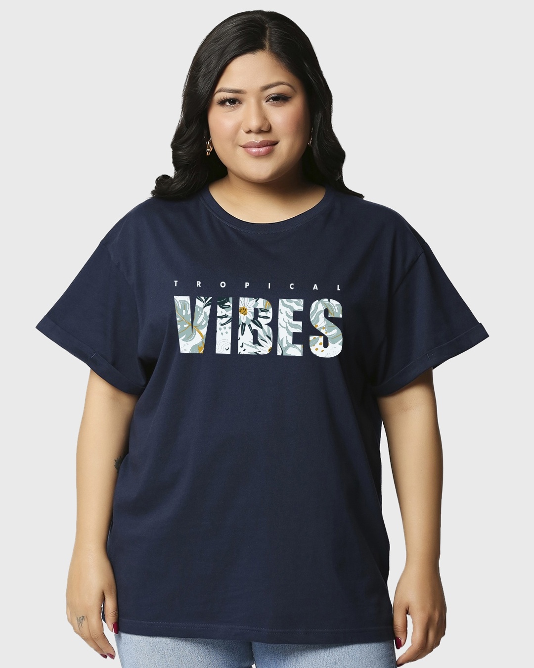 Women's Blue Tropical Vibes Graphic Printed Plus Size Boyfriend T-shirt