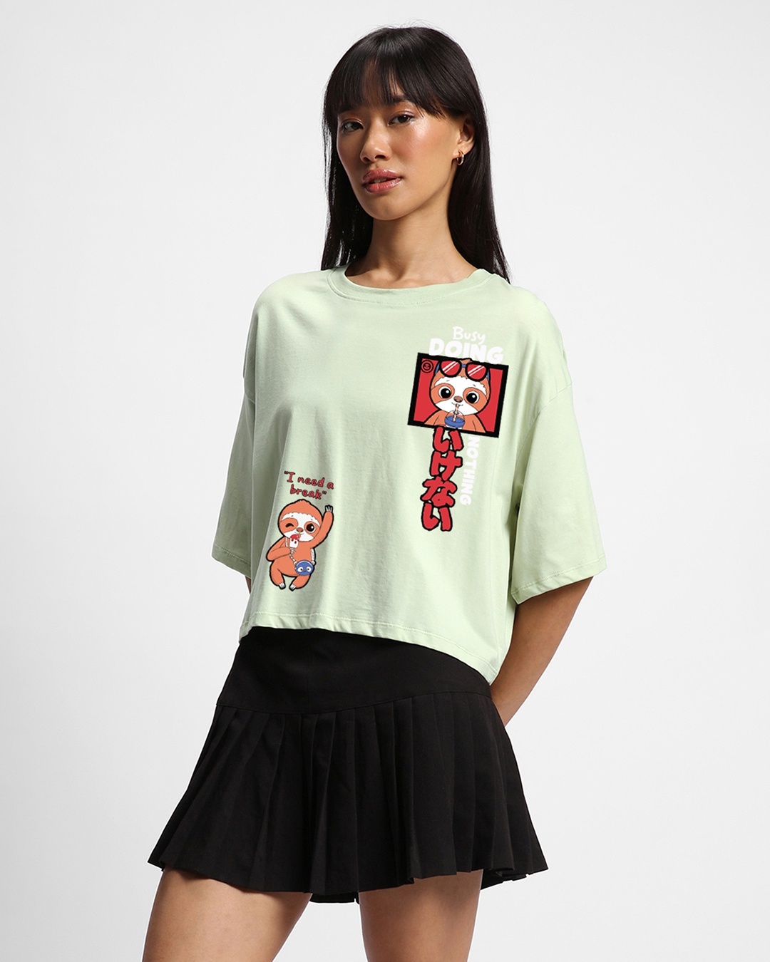 Women's Green Busy Doing Nothing Graphic Printed Oversized Short Top