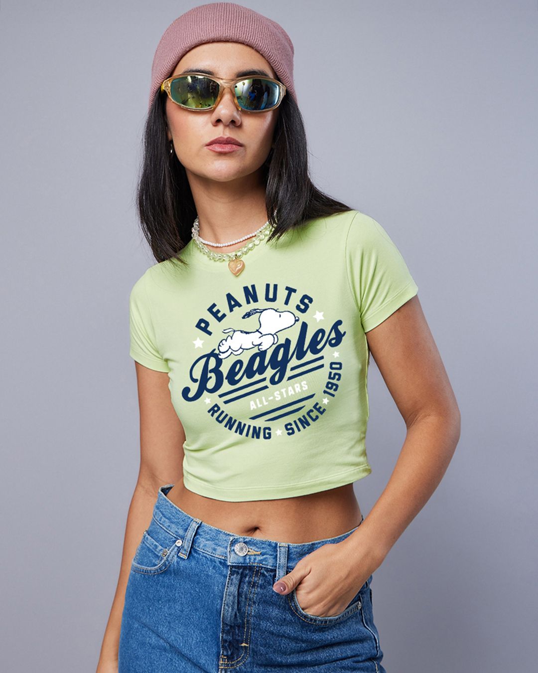 Women's Green Peanuts All Star Graphic Printed Slim Fit Short Top