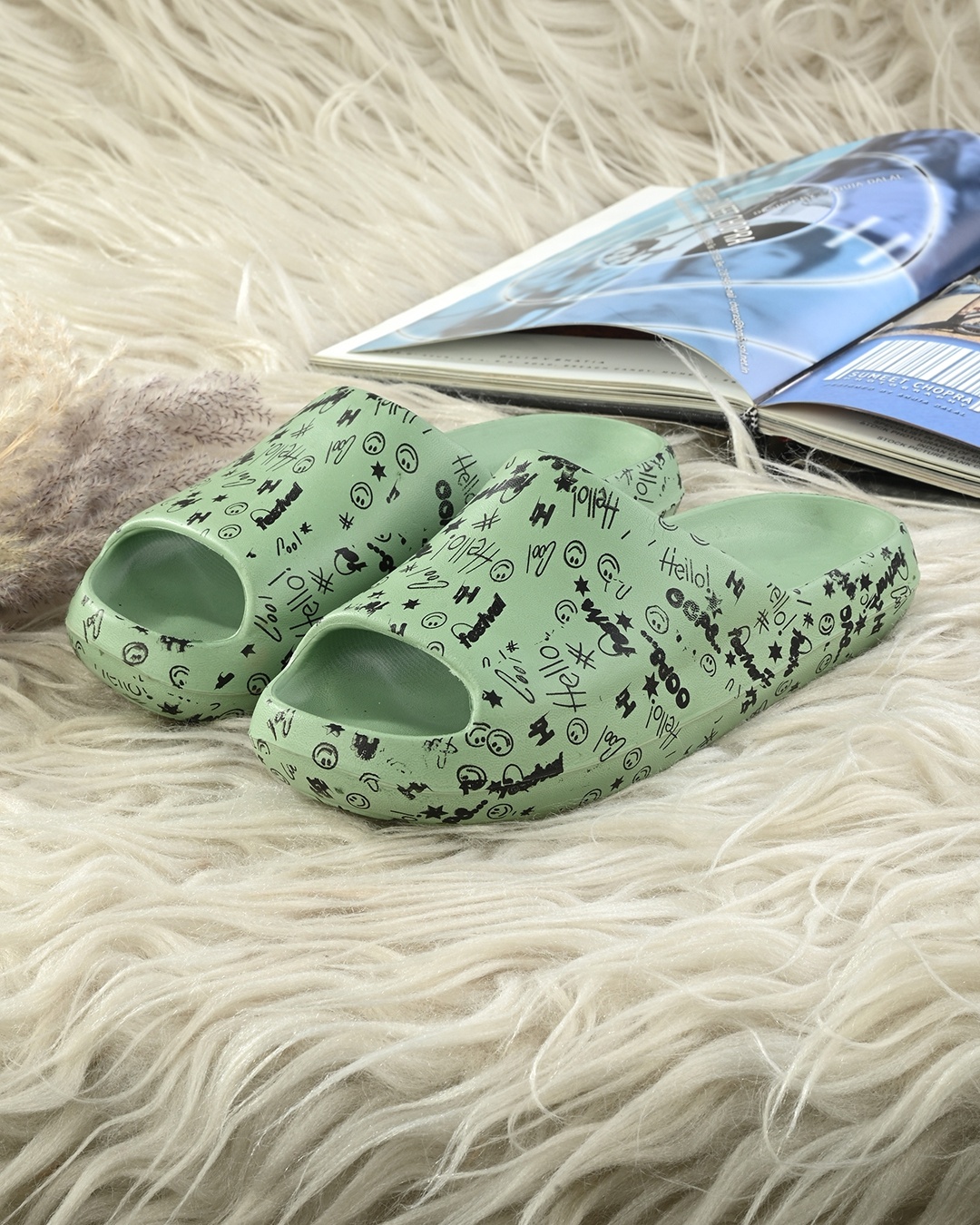 Women's Green Printed Sliders