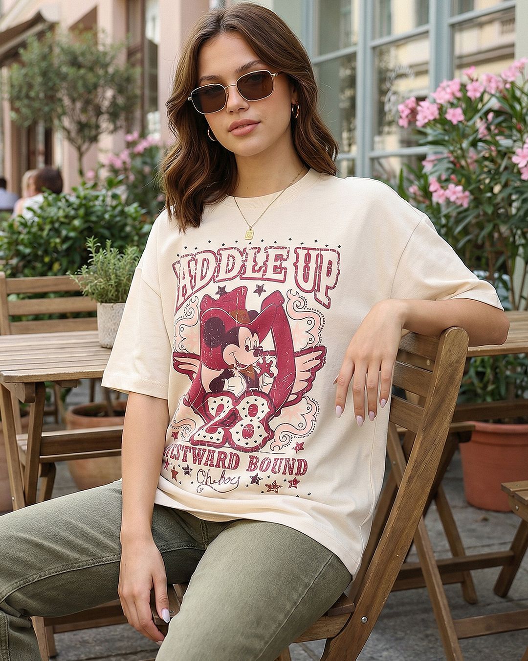 Women's Beige Saddle Up Graphic Printed Oversized T-shirt