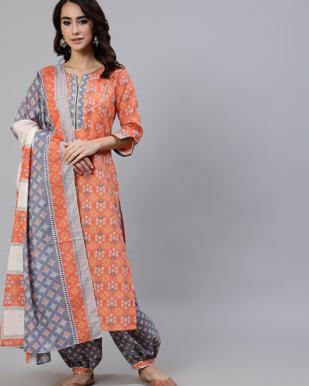 Women's Orange and Grey Ethnic Motif Printed Kurta & Balloon Palazzo With Dupatta Set