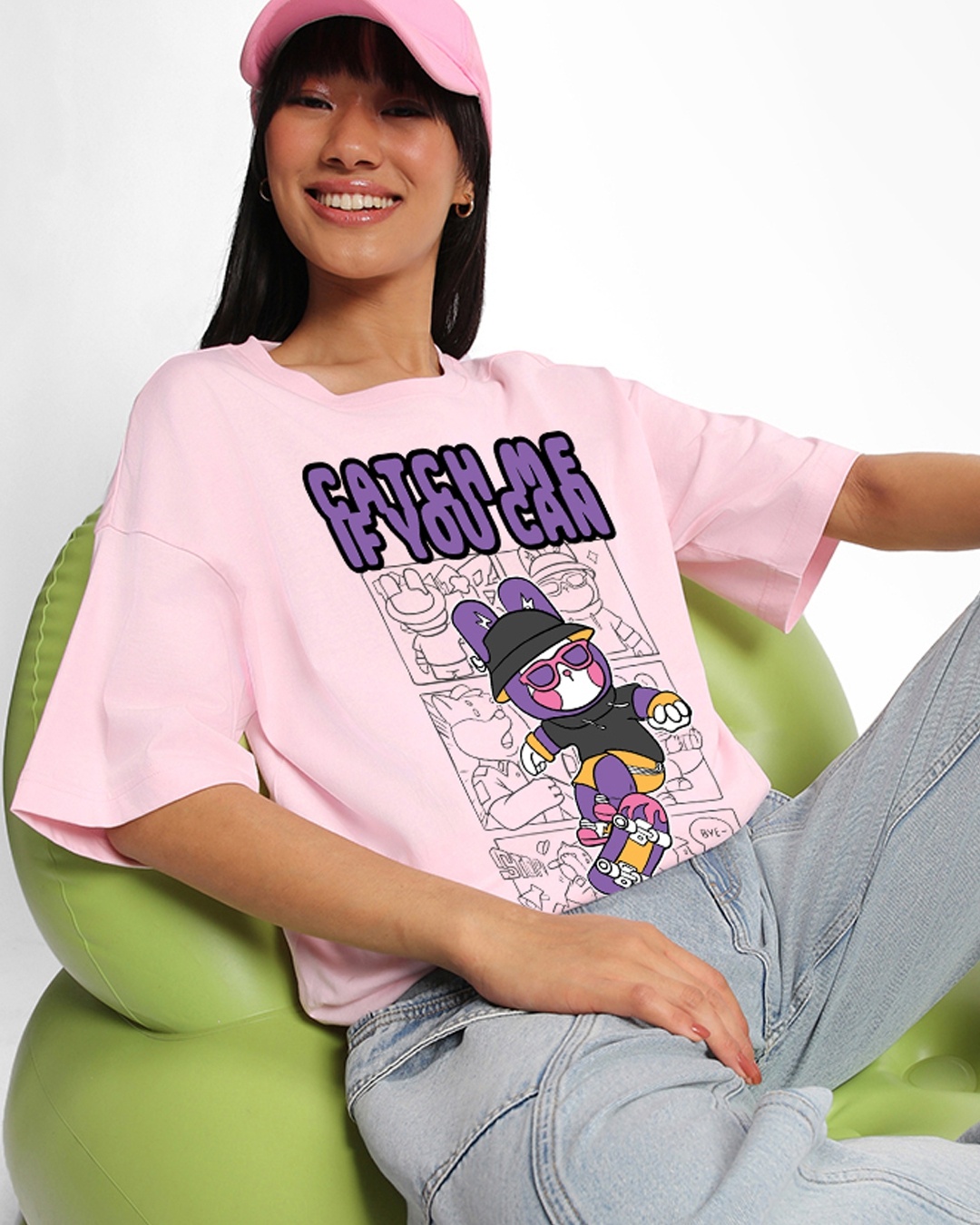Women's Pink Catch Me If You Can Graphic Printed Oversized T-shirt
