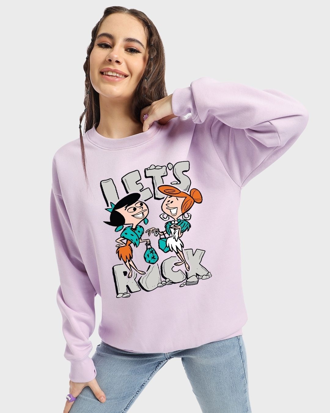 Women's Purple The Flintstones Let's Rock Graphic Printed Oversized Sweatshirt