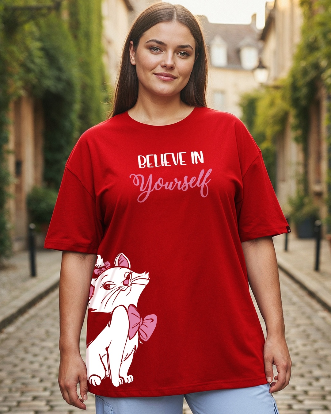 Women's Red Believe Cat Graphic Printed Oversized Plus Size T-shirt
