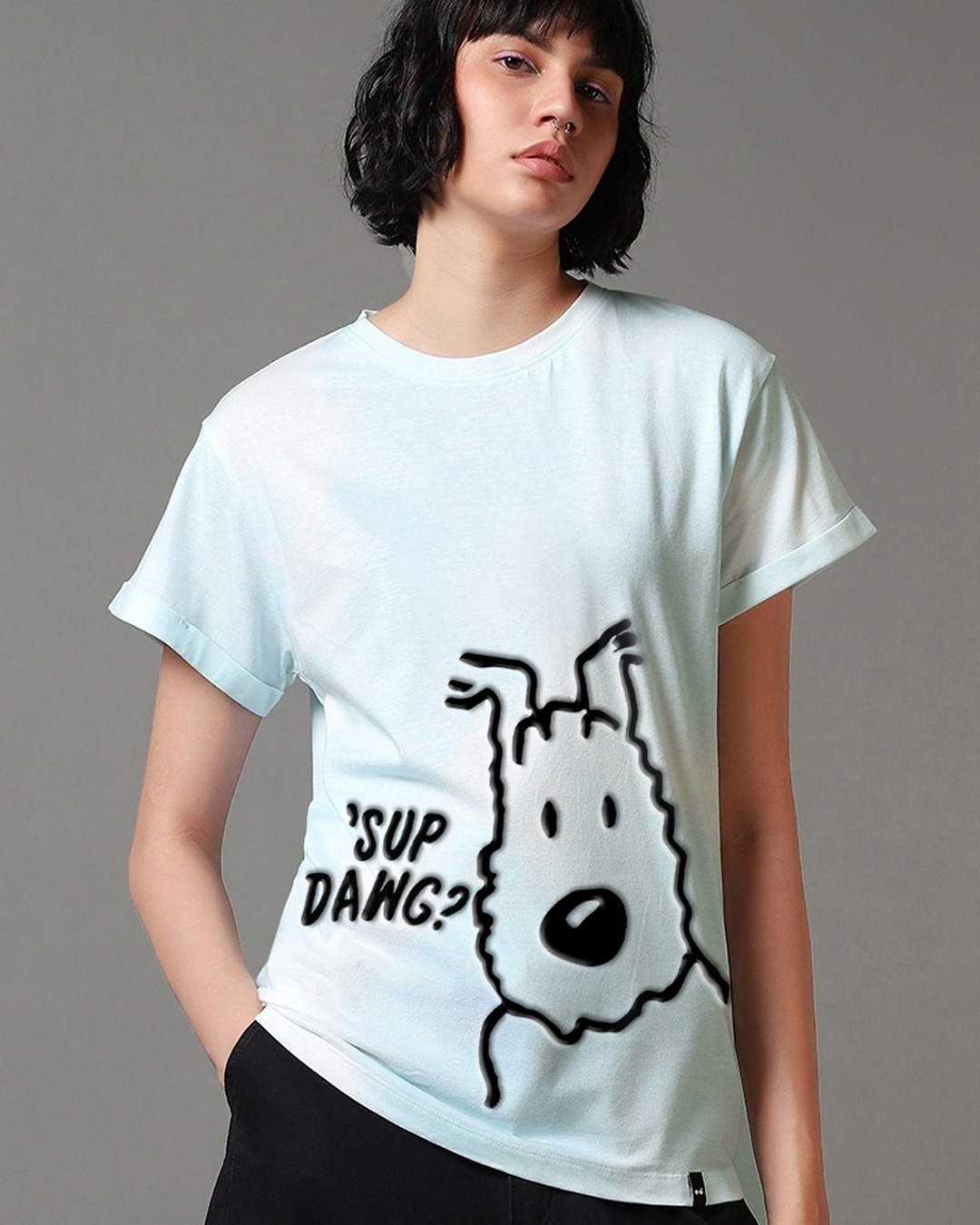 Women's White & Blue Wassup Dawg Graphic Printed Tie & Dye Boyfriend T-shirt