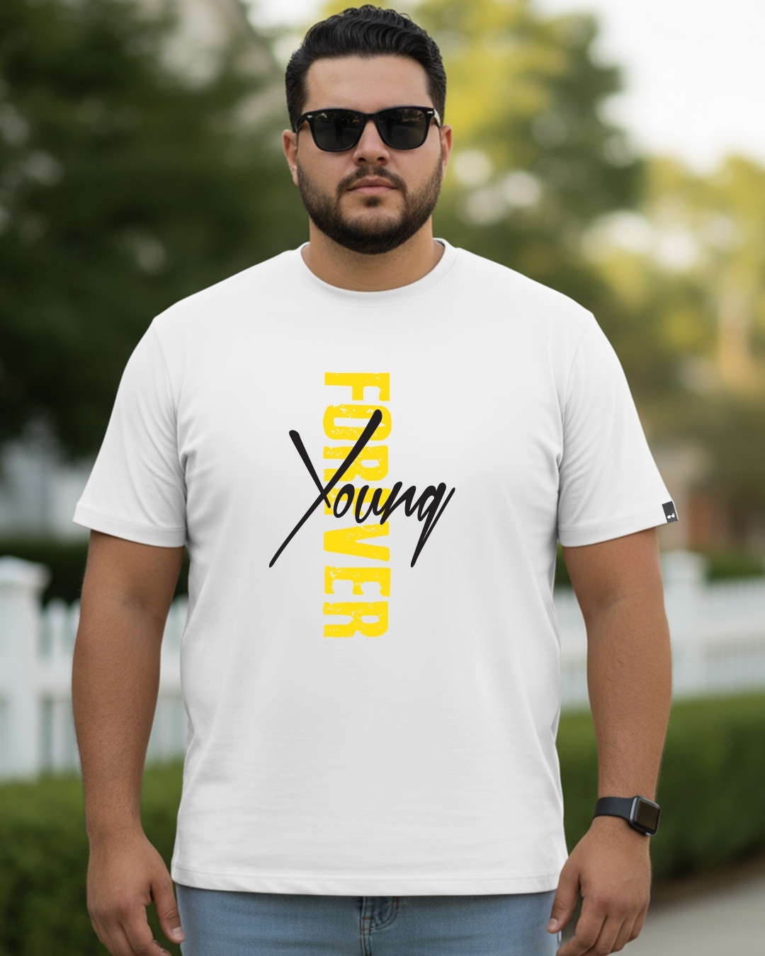 Men's White Young Forever Side Graphic Printed Plus Size T-shirt