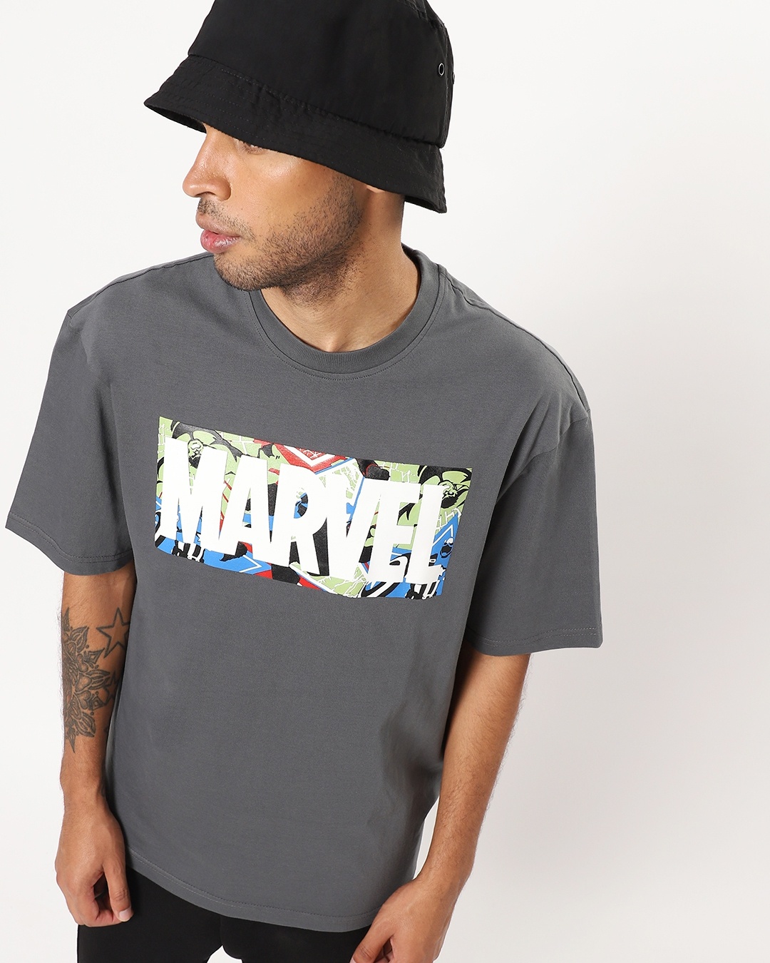Men's Grey Marvel Typography Oversized Fit T-shirt
